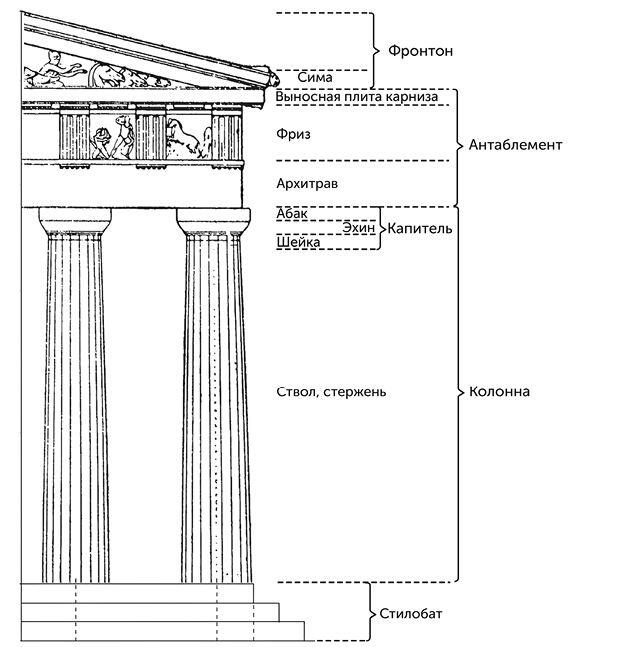 Наиболее хорошо сохранившаяся и, может быть, наиболее интересная в архитектурном отношении часть Парфенона его наружные колоннады представляет собой замечательный пример художественно разработанной стоечно-балочной конструкции. Сущность стоечно-балочной конструкции, в отличие от стены и свода, заключается в наличии отдельно стоящих вертикальных опор, пролеты между которыми перекрыты горизонтальными перекладинами, сделанными, например, из дерева или камня. Такие перекрывающие пролет перекладины называются архитравом или архитравными балками, а самая система перекрытия перекрытием архитравным, в отличие от сводчатого. Перекрытие в своде не только давит на опоры сверху вниз, но и распирает их в стороны; в стоечно-балочной конструкции балки давят на опоры только сверху вниз, а напряжение действующих в ней главных сил сводится к тяжести горизонтальной нагрузки и к противодействию ей в вертикальной опоре. Художественная переработка стоечно-балочной конструкции и состоит прежде всего в выявлении указанных двух сил, действующих в противоположных направлениях: сверху вниз и снизу вверх.