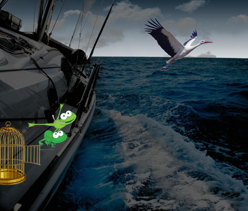 Проснувшись с первыми лучами солнца, которое заглянуло к ним под навес, Кика и Кави обнаружили, что большую лодку, в которой они устроились вчера на ночлег, качает. Высунувшись из-под укрытия, лягушата увидели, что их окружает бесконечная вода, в их сторону летят соленые брызги, а волны качают судно, как когда то мама качала их колыбельку, когда они были совсем маленькие. Пока брат с сестрой спали, яхта вышла в открытое море. Лягушата впервые видели сразу столько воды. Что вода может быть соленой, они до сих пор и не подозревали. Над головами тем временем возникли большие белые птицы. Они кружили прямо над лягушатами, и Кави вспомнила недавний урок. Учитель Квак предупреждал, что больших птиц надо бояться, и, увидев их поблизости, немедленно прятаться. Кави потянула Кику в сторону навеса и очень вовремя это сделала. Только они скрылись, как на их место села большая птица. Она явно что то искала. Только что она видела на палубе лягушат и размечталась хорошо позавтракать. Но лягушата вдруг исчезли. Чайка, а это была большая морская чайка, разочарованно крутила головой, сидя на пустой палубе. Вскоре птице надоело сидеть в одиночестве, и она улетела, присоединившись к своей стае. Чайки высматривали в воде маленьких рыбешек, выхватывали их из воды и лакомились. Появившиеся на палубе люди начали бросать птицам кусочки булки. Вскоре птицы насытились и улетели по своим птичьим делам. А Кика и Кави еще долго сидели в своем укрытии и переживали только что миновавшую опасность. Очень хотелось кушать. Маленькие животики все сильнее сводило от голода. Кика отважился выйти на разведку. Раздобыть еду оказалось не таким простым делом. Мошкары было мало, и ловить ее было небезопасно. Лягушата очень боялись попасться людям на глаза, поскольку не знали, что за этим может последовать. Кике удалось поймать немного мошек. Этого хватило, чтобы слегка утолить голод.