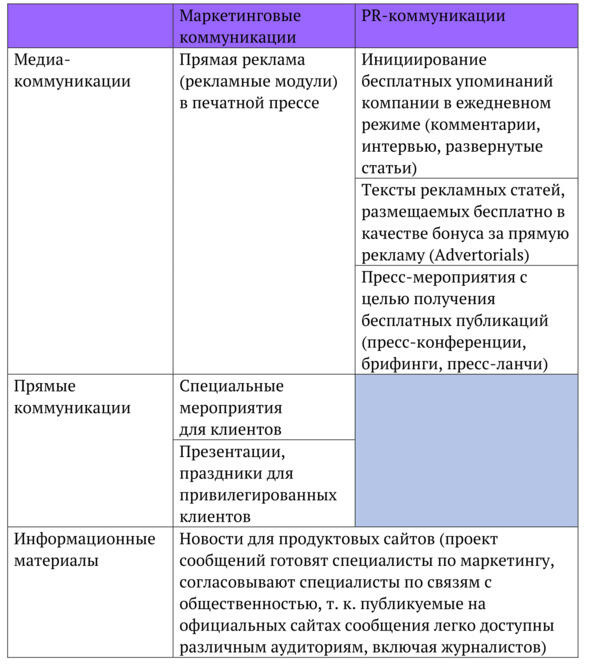 Очень часто никакой грани между PR и маркетингом не проводится. И если организационно это может быть оправдано малыми размерами компании, то по смыслам и целям эти две функции необходимо всегда четко разграничивать.