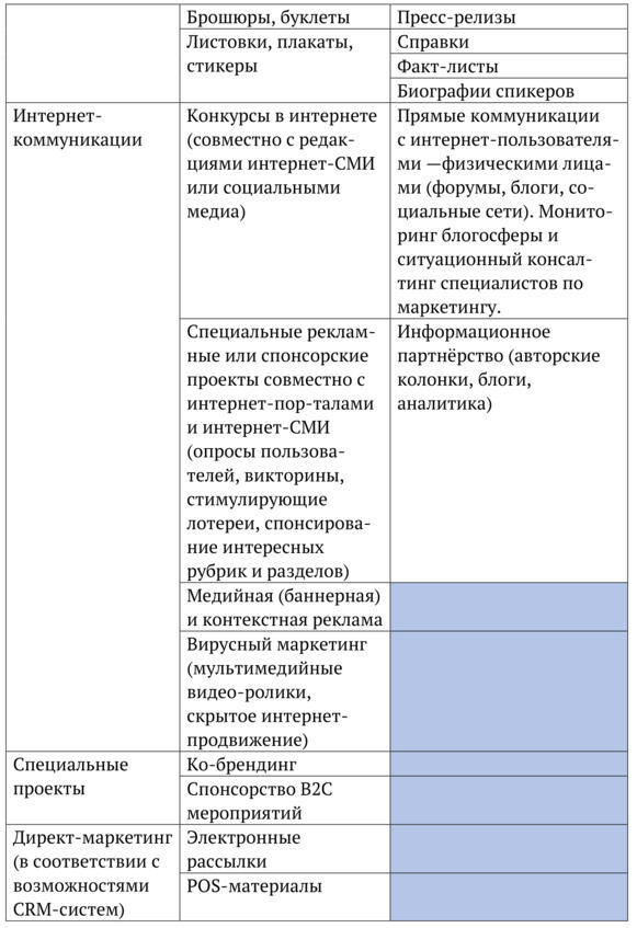 В таблице ниже представлен пример матрицы распределения инструментов и каналов коммуникаций в маркетинге и PR на примере направления работы с частными клиентами: