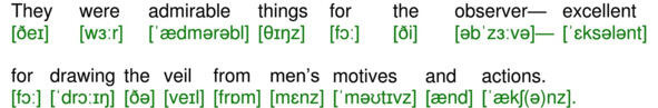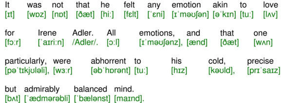 To [tu¦] Sherlock [ʃɜ¦lɒk] Holmes [həʊmz] she [ʃi¦] is [ɪz] always [ɔ¦lweɪz] the [ðə] woman [wʊmən]. I [aɪ] have [hæv] seldom [sɛldəm] heard [hɜ¦d] him [hɪm] mention [mɛnʃən] her [hɜ¦r] under [ʌndər] any [ɛni] other [ʌðə] name [neɪm]. In [ɪn] his [hɪz] eyes [aɪz] she [ʃi¦] eclipses [ɪklɪpsɪz] and [ænd] predominates [prɪdɒmɪneɪts] the [ðə] whole [həʊl] of [ɒv] her [hɜ¦] sex [sɛks]. It [ɪt] was [wɒz] not [nɒt] that [ðæt] he [hi¦] felt [fɛlt] any [ɛni] emotion [ɪməʊʃən] akin [əkɪn] to [tu¦] love [lʌv] for [fɔ¦r] Irene [aɪri¦n] Adler. All [ɔ¦l] emotions [ɪməʊʃənz], and [ænd] that [ðæt] one [wʌn] particularly [pətɪkjʊləli], were [wɜ¦r] abhorrent [əbhɒrənt] to [tu¦] his [hɪz] cold [kəʊld], precise [prɪsaɪz] but [bʌt] admirably [ædmərəbli] balanced [bælənst] mind [maɪnd]. He [hi¦] was [wɒz], I [aɪ] take [teɪk] it [ɪt], the [ðə] most [məʊst] perfect [pɜ¦fɪkt] reasoning [ri¦znɪŋ] and [ænd] observing [əbzɜ¦vɪŋ] machine [məʃi¦n] that [ðæt] the [ðə] world [wɜ¦ld] has [hæz] seen [si¦n], but [bʌt] as [æz] a [ə] lover [lʌvə] he [hi¦] would [wʊd] have [hæv] placed [pleɪst] himself [hɪmsɛlf] in [ɪn] a [ə] false [fɔ¦ls] position [pəzɪʃən]. He [hi¦] never [nɛvə] spoke [spəʊk] of [ɒv] the [ðə] softer [sɒftə] passions [pæʃənz], save [seɪv] with [wɪð] a [ə] gibe [ʤaɪb] and [ænd] a [ə] sneer [snɪə]. They [ðeɪ] were [wɜ¦r] admirable [ædmərəbl] things [θɪŋz] for [fɔ¦] the [ði] observer [əbzɜ¦və]  excellent [ɛksələnt] for [fɔ¦] drawing [drɔ¦ɪŋ] the [ðə] veil [veɪl] from [frɒm] mens [mɛnz] motives [məʊtɪvz] and [ænd] actions [ækʃnz]. But [bʌt] for [fɔ¦] the [ðə] trained [treɪnd] reasoner [ri¦znə] to [tu¦] admit [ədmɪt] such [sʌʧ] intrusions [ɪntru¦ʒənz] into [ɪntu¦] his [hɪz] own [əʊn] delicate [dɛlɪkɪt] and [ænd] finely [faɪnli] adjusted [əʤʌstɪd] temperament [tɛmpərəmənt] was [wɒz] to [tu¦] introduce [ɪntrədju¦s] a [ə] distracting [dɪstræktɪŋ] factor [fæktə] which [wɪʧ] might [maɪt] throw [θrəʊ] a [ə] doubt [daʊt] upon [əpɒn] all [ɔ¦l] his [hɪz] mental [mɛntl] results [rɪzʌlts]. Grit [grɪt] in [ɪn] a [ə] sensitive [sɛnsɪtɪv] instrument [ɪnstrʊmənt], or [ɔ¦r] a [ə] crack [kræk] in [ɪn] one [wʌn] of [ɒv] his [hɪz] own [əʊn] high-power [haɪ] [paʊə] lenses [lɛnzɪz], would [wʊd] not [nɒt] be [bi¦] more [mɔ¦] disturbing [dɪstɜ¦bɪŋ] than [ðæn] a [ə] strong [strɒŋ] emotion [ɪməʊʃən] in [ɪn] a [ə] nature [neɪʧə] such [sʌʧ] as [æz] his [hɪz]. And [ænd] yet [jɛt] there [ðeə] was [wɒz] but [bʌt] one [wʌn] woman [wʊmən] to [tu¦] him [hɪm], and [ænd] that [ðæt] woman [wʊmən] was [wɒz] the [ðə] late [leɪt] Irene [aɪri¦n] Adler, of [ɒv] dubious [dju¦biəs] and [ænd] questionable [kwɛsʧənəbl] memory [mɛməri].