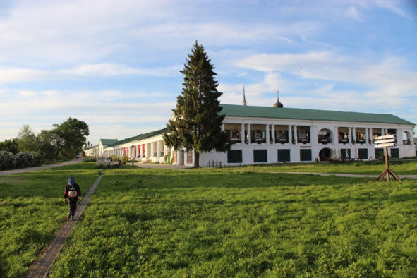 Центр здания украшен портальными воротами с золотым шпилем на вершине которого расположен герб древнего великокняжеского города Суздаля.