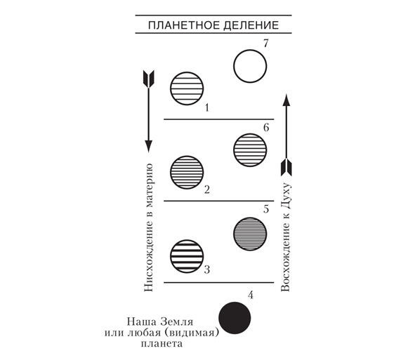Когда последний цикл, несущий человека, закончится на последней планете (сфере G планеты Земля) и человечество достигнет в массе своей степени Будды (именно таково предназначение человеческой жизни, через реинкарнации душа растёт духовно до уровня Бога) и перейдёт из объективного бытия в тайну Нирваны тогда «видимое станет невидимым, конкретное возвратится к своему до цикловому состоянию атомического распадения». Наступит пралайя, и ни человек, ни животное, ни даже растение не будут свидетелями её. Только будут планеты с их «минеральными царствами», разложенными, но не уничтоженными, которые «в свои сроки вновь соберут силы для начала новой манвантары». И это продолжается бесконечно. Древним народам Востока символом развития виделся простой круг, где левая половина дуга, нисходящая (эманация) от духа в материю, правая восходящая (эволюция) от материи к духу (рис. 1).