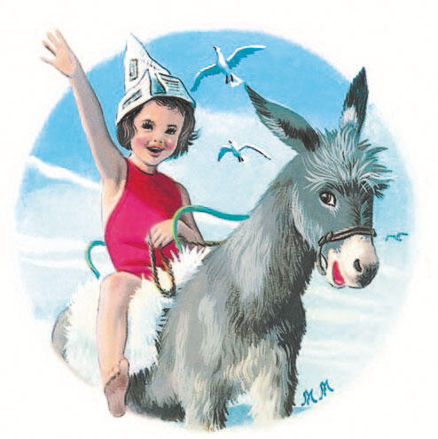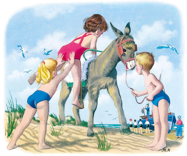 А это наш любимый ослик Дуся. Он ласковый и весёлый, с умильной белой мордочкой. Женя кормит Дусю, ухаживает за ним, а Дуся каждый день катает нас с Верой по очереди вдоль морского берега.