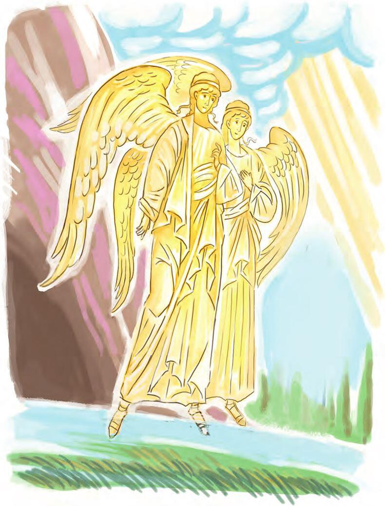 Вдруг пастухи услышали, что кто-то тихо им подпевает. Они подняли головы может, это ночные птицы? Но это были не птицы. Тьма над их головами расступилась. С неба полился свет и затопил всё поле, ночью стало светлее, чем днём. В небе летали ангелы.