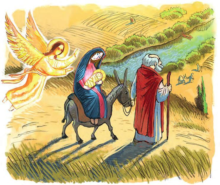 Иосиф тут же проснулся и рассказал Марии свой сон. Они быстро собрали все вещи, Мария завернула Сына в тёплое одеяло, прижала Его к груди и села на ослика. Иосиф взял ослика за уздцы и быстро повёл по дороге. Они очень торопились, чтобы злой царь не догнал их.