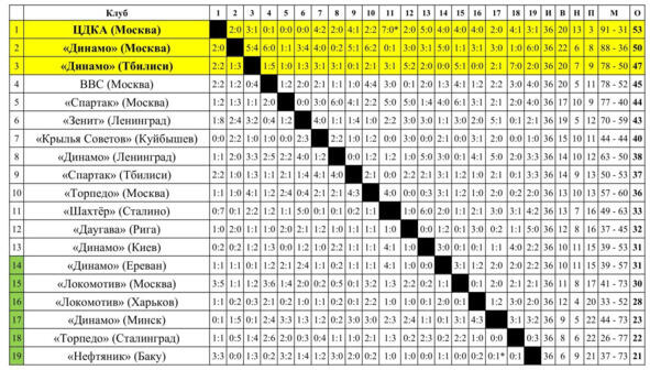 Чемпион ЦДКА (Москва): В. Никаноров (в, 18 матчей), В. Чанов (в, 13), О. Бобков (в, 5), В. Чистохвалов (31, 1), А. Башашкин (29, 1), Ю. Нырков (24), А. Ерошин (19), В. Белов (9), И. Кочетков (4), А. Крушенок (3), А. Родионов (1), А. Водягин (36, 5), А. Петров (21), М. Родин (9), А. Гринин (34, 10), В. Николаев (30, 9), Б. Коверзнев (24, 21), В. Соловьёв (35, 18), В. Дёмин (34, 19), В. Чайчук (18, 1), А. Зайцевский (6, 3), В. Елизаров (5, 3), В. Мухортов (1). Старший тренер Б.А.Аркадьев.