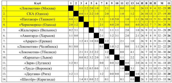 «Локомотив» (Москва), СКА (Одесса), «Пахтакор» (Ташкент) и «Черноморец» (Одесса) вышли в Первую группу Класса «А».