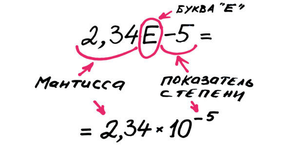 Напомним, что такое «число с плавающей точкой». Это особая компьютерная запись числа. Часто встречается при выводе чисел на экран. Такое число состоит из мантиссы (значащей части) и показателя степени, см. рис.