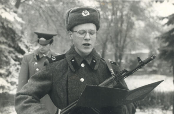 Советские воины также присягали Янусу. На фото рядовой Новокшонов принимает присягу, декабрь 1987 года, Нальчик-20: