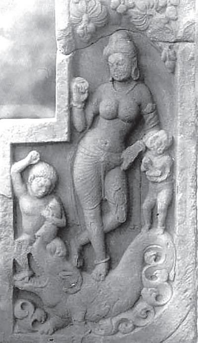 Богиня часто изображается в индуистском искусстве в Белом сари и верхом на крокодиле. Ганга часто появляется в скульптуре возле дверей храма и на декоративных рельефных панелях вместе со своей сестрой речной богиней Ямуной. Знаменитое изображение Ганги находится на песчаниковой перемычке храма в Бешнагаре. Датируемая 500 годом н. э., богиня стоит на Макаре (мифологическая смесь крокодила и слона), которая символизирует животворящую природу воды.
