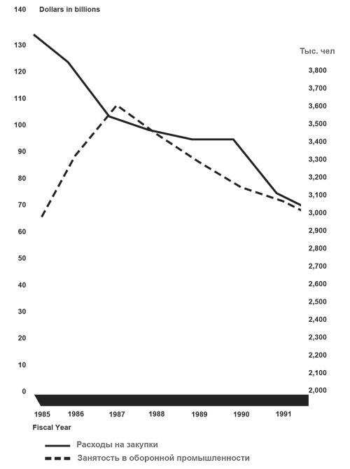 Рис. 1.4. Расходы на закупки Министерства обороны и занятость в оборонной промышленности США в 19851991 гг.[12]