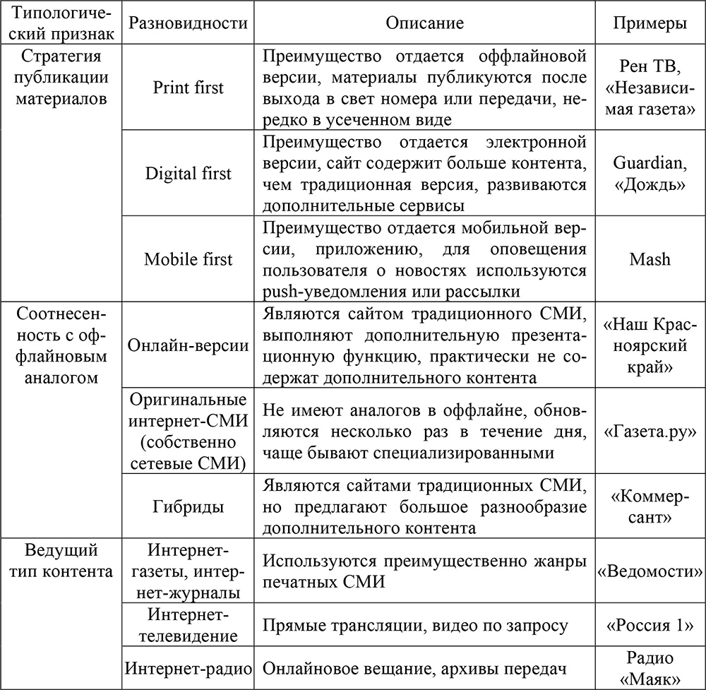 Охватить весь спектр онлайн-изданий нелегко, однако мы можем описать их, опираясь на типологические признаки. Специфика интернет-СМИ состоит в их подвижности, изменчивости, а потому в некоторых случаях деление на группы выглядит достаточно условным.