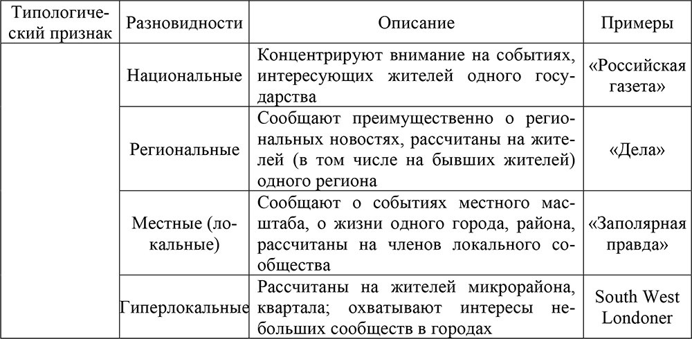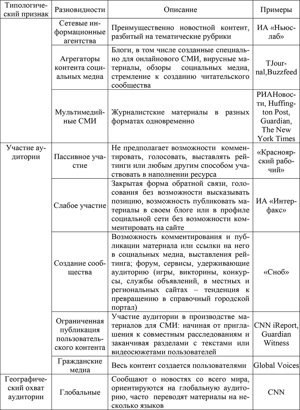 В табл. 2 приведены только те признаки, которые отличают онлайновые СМИ от традиционных. Общие для всех типов СМИ признаки: охват действительности, тип собственника, аудитория, тематика и др. в дополнительных комментариях не нуждаются.