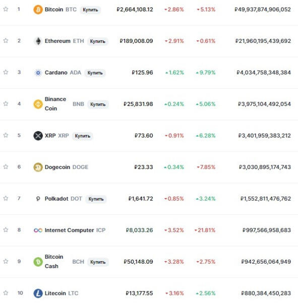 Топ-10 по версии coinmarketcap, 1 июня 2021