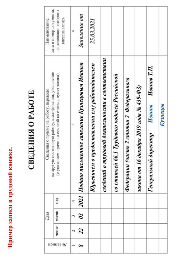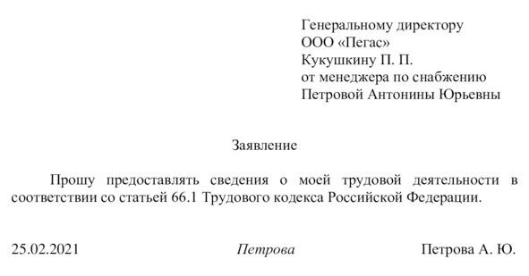 «Подано письменное заявление (фамилия, имя, отчество) о предоставлении ему (ей) работодателем сведений о трудовой деятельности в соответствии со статьей 66.1 Трудового кодекса Российской Федерации (часть 2 статьи 2 Федерального закона от 16 декабря 2019 г. N 439-ФЗ)».