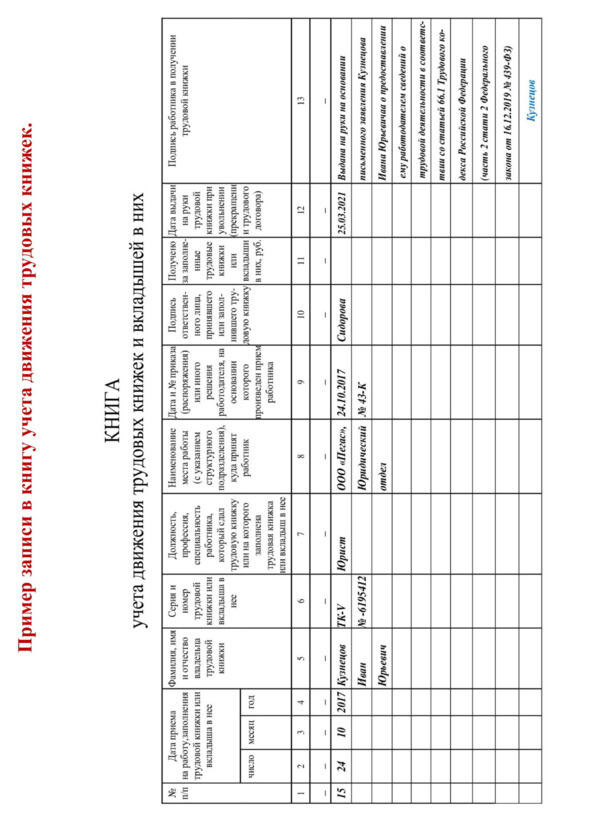 работодатель делает запись в книге учета и движения трудовых книжек в графе 13: