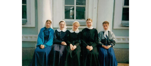 Еще бы! Восемь девчонок и пять из них живет в Обители. «Городскими» мы называли тех, кто жили дома за оградой обители и приходили в гимназию из поселка. У Лены З. мама была поваром в Детском Корпусе (это здание, где живут Стремские усыновленные дети), у Оли Т. мама и папа в административном корпусе трудились, а у Насти М. мама работала в ризнице (шила и приводила в порядок церковное облачение). Перед уроками каждое утро у нас проходит линейка. На ней проверяют посещаемость и чистоту воротничков с косынками. Учителя приходят к нам в класс.