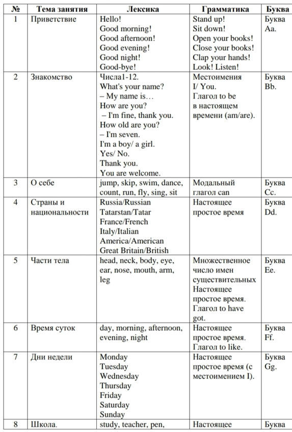 Основные темы для изучения в 1 классе: «Знакомство», «Семья», «Дом», «Части тела», «Школа», «Цвета», «Животные», «Игрушки», «Комната», «Одежда», «Умения», «Еда».