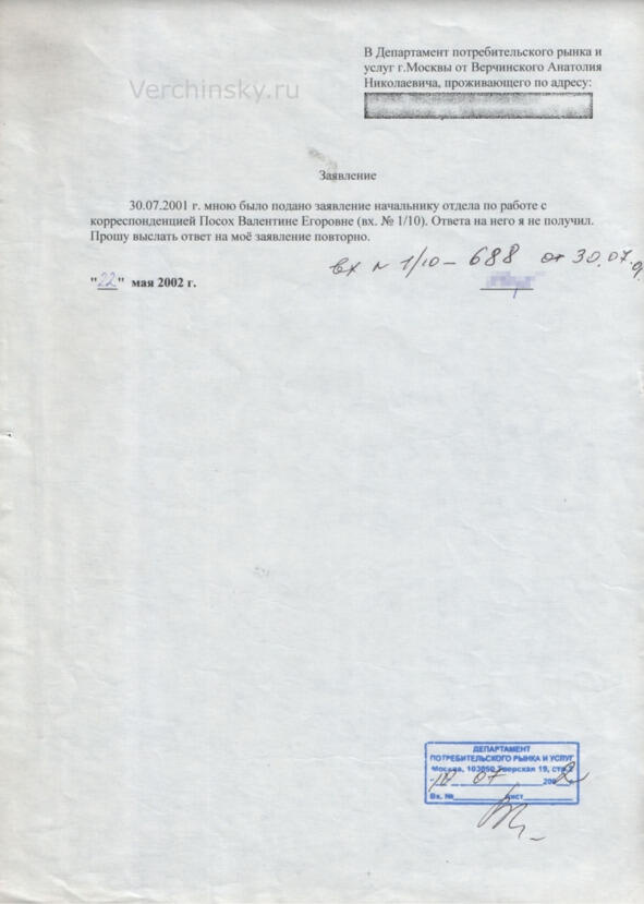 «30.07.2001 мною было подано заявление начальнику отдела по работе с корреспонденцией Посох Валентине Егоровне (вх. 1/10). Ответа на него я не получил. Прошу выслать ответ на моё заявление повторно».
