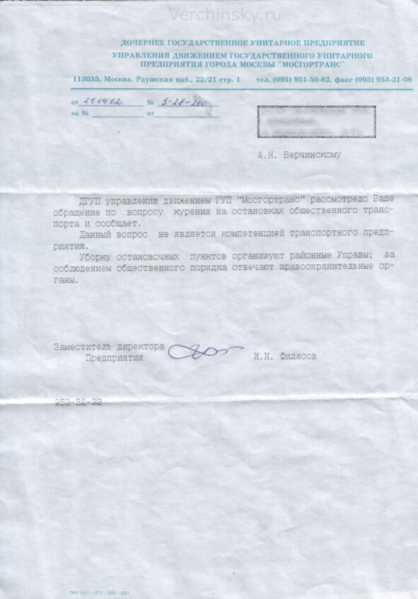 ДГУП управления движением ГУП «Мосгортранс» рассмотрело Ваше обращение по вопросу курения на остановках общественного транспорта и сообщает.