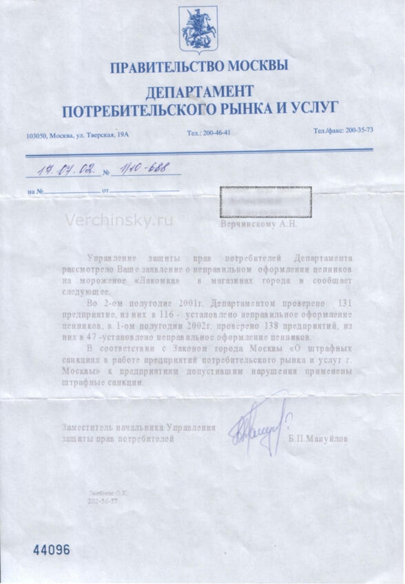 Управление защиты прав потребителей Департамента рассмотрело Ваше заявление о неправильном оформлении ценников на мороженое «Лакомка» в магазинах города и сообщает следующее.