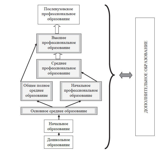 Структура системы непрерывного образования, по Закону об образовании [18, С. 2428] соответствующая возможным путям образовательного развития личности, приведена на схеме рис. 1.1. Заливкой обозначена область перехода от общего образования («школа») к высшему профессиональному («вуз»).