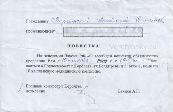 Поэтому, когда мне пришла очередная повестка от упомянутого выше военкома Буянова, я подал в суд на военкомат г. Королева, в котором состоял на воинском учете.