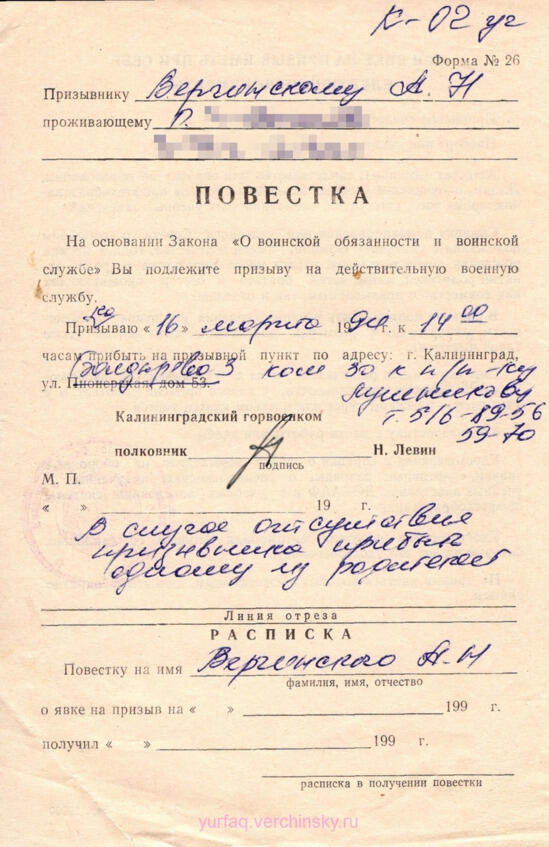 Со школы состоял на учёте в военкомате г. Королева (до 1996 года этот город назывался Калининградом), куда меня периодически вызывали повестками.