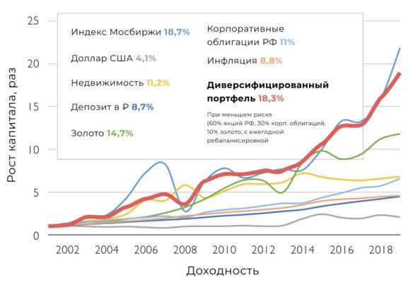 Доходности классов активов в России, 20022019 гг. Среднегодовая рублевая доходность за 18 лет