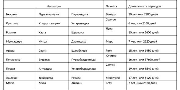 Эта система охватывает 120 лет средняя продолжительность жизни человека, состоящих из девяти планетных периодов различной протяженности. Каждая планета управляет тремя накшатрами и распространяет свое влияние на определенное количество лет.