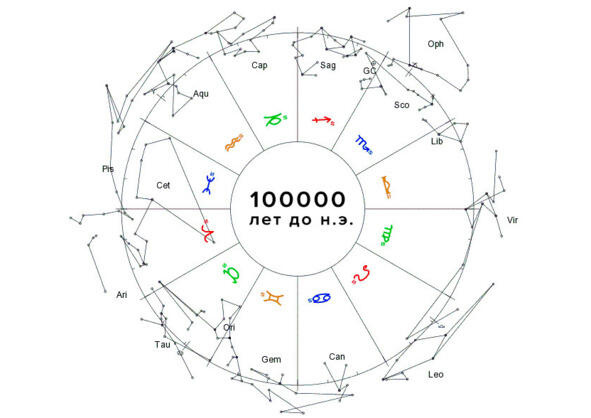 5000 лет назад созвездия имели немного другой вид для земного наблюдателя. Программисты попытались даже смоделировать то, как, возможно, выглядели созвездия зодиака 100 тысяч лет назад. Маловероятно, что было именно так, как изображено на рисунке, но это очень наглядно показывает влияние смещения земной оси на динамику изменения контуров созвездий.