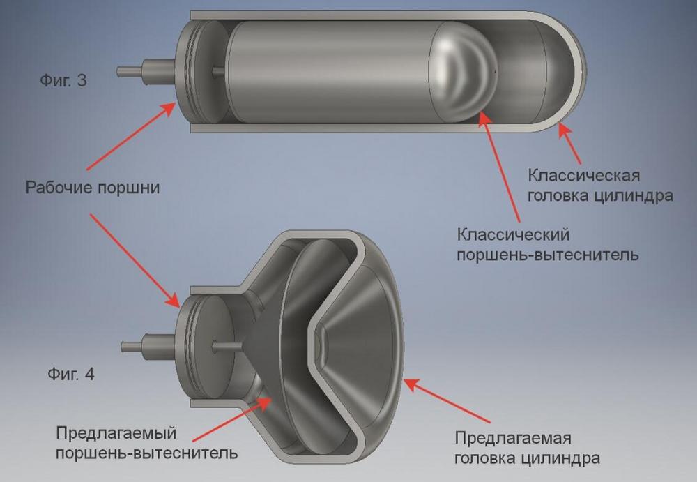 Геометрия предлагаемого поршня-вытеснителя и соответствующей ему головки цилиндра может варьироваться в широких пределах, но подбирается так, чтобы верхняя поверхность поршня-вытеснителя в положении верхней «мёртвой точки» могла прилегать без зазоров к внутренней теплоподводящей поверхности головки цилиндра для контактного получения от неё тепла, а нижняя поверхность поршня-вытеснителя в положении нижней «мёртвой точки» к теплоотводящей внутренней поверхности цилиндра для контактной же отдачи тепла.