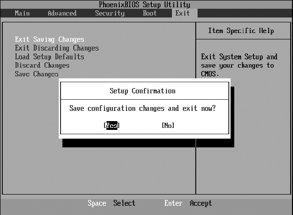 На этом настройка BIOS завершена, и можно выйти из BIOS Setup с сохранением сделанных изменений. Для этого перейдите на вкладку Exit и нажмите клавишу Enter на позиции Exit Saving Changes. В результате появится окно, в котором нужно подтвердить свое решение путем выбора ответа Yes (рис. 2.2). Если этого не сделать, загрузка с DVD-привода будет невозможна до тех пор, пока не будут изменены описанные параметры.