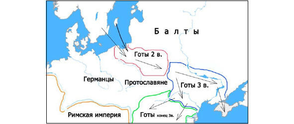 В первые века н.э. главными врагами славян были римляне. Затем в 4 веке н.э. с севера пришли племена готов. Образовалось готское королевство Германариха. Готский писатель Иордан в книге «Гетика» описал их королевство. В число подданных Германариха входили, очевидно, и предки славян. В те времена предки славян делились на антов, венедов и склавен (которые еще раньше, еще во времена скифов, назывались сколотами). Анты жили южнее и потому в большей степени подвергались нападениям степняков.
