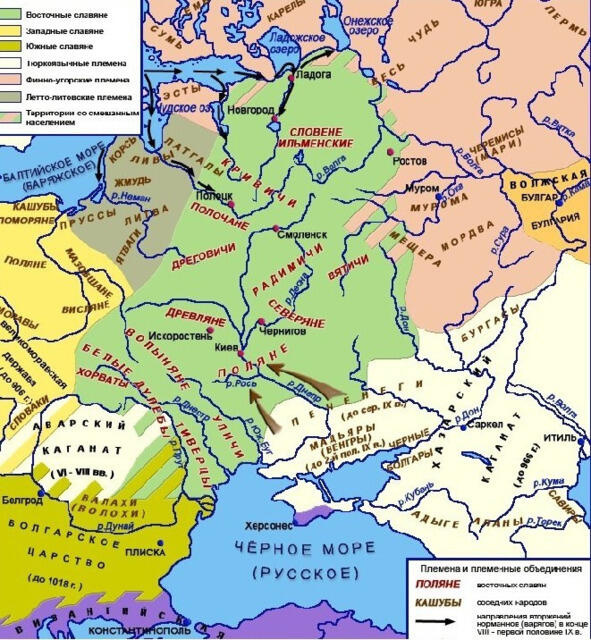 Вятичи, радимичи, северяне и т. д., как уже говорилось, это крупные племенные объединения восточных славян. Вятичи жили в центральной России, где сейчас Вятка и Москва, кривичи где сейчас Минск и Полоцк, поляне где сейчас Киев. Все восточные славяне разговаривали практически на одном языке и понимали друг друга.