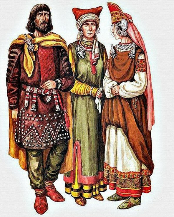 Ученые в наше время восстановили (реконструировали) национальный костюм восточных славян. Длинные платья у женщин. Плащи у мужчин. Заколка фибула. Ожерелья на шее. Элементы одежды носят охранительный характер от злых сил. Головной убор кика, повторяющая рога быка или коровы символ замужней женщины в древнем славянском мире. Кольца височные.