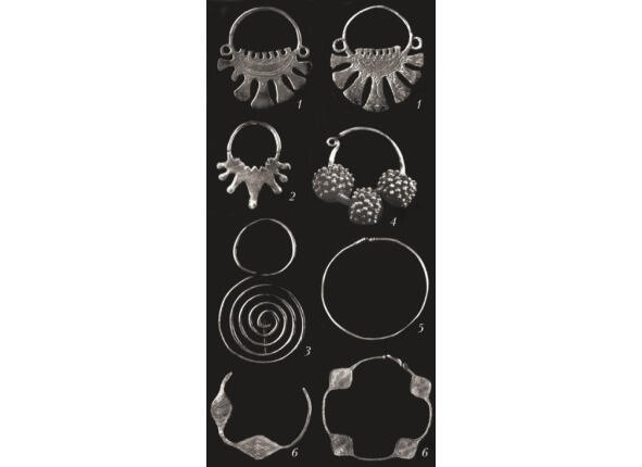 Височные кольца восточных славян: 1 вятичей; 2 радимичей; 3 северян; 4 дреговичей; 5 кривичей; 6 словен ильменских. 1112 вв.