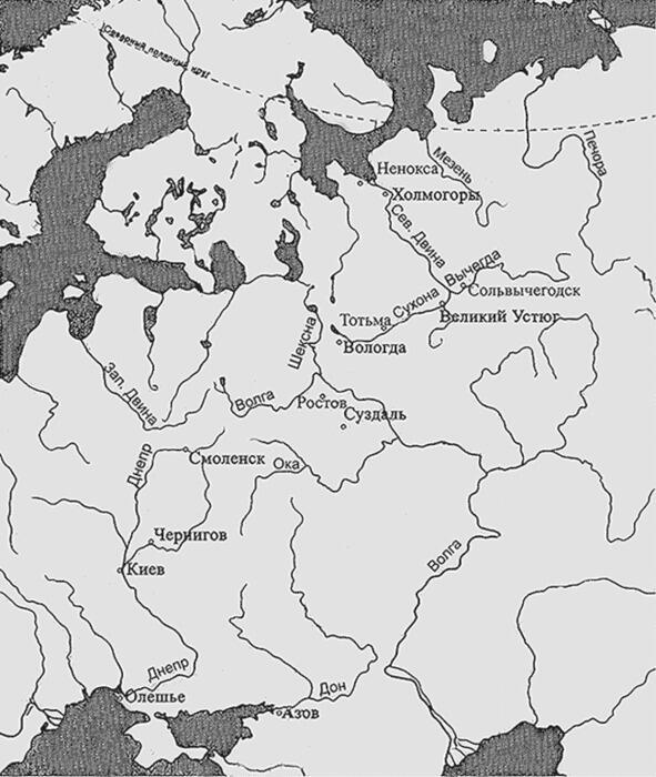 Реки имели важнейшее значение прежде всего как наиболее удобные пути передвижения в те времена, когда трудно и опасно было пробираться с товарами через сплошные чащобы лесов. На карте реки европейской части нашей страны. Перерисуйте эту карту в тетрадь.