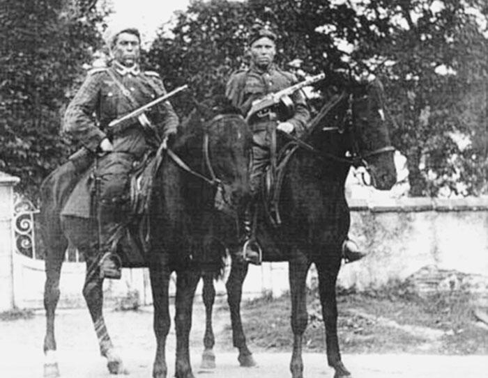 Солдаты 623-го казачьего батальона позируют фотографу. В августе 1943 г. это подразделение входило в состав немецкой группы армий «Центр» на Восточном фронте. Немцы высоко ценили казаков как прекрасных кавалеристов и разведчиков. Обратите внимание они вооружены автоматами советского производства