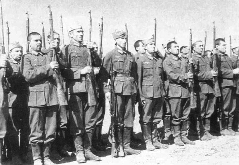 В годы Второй мировой войны, несмотря на нацистскую идеологию, немцы призвали на службу военной машине Третьего рейха сотни тысяч русских, как и этот разношерстный отряд на снимке. Их обязанности варьировались от чистки отхожих мест и работы на кухне до участия в боях
