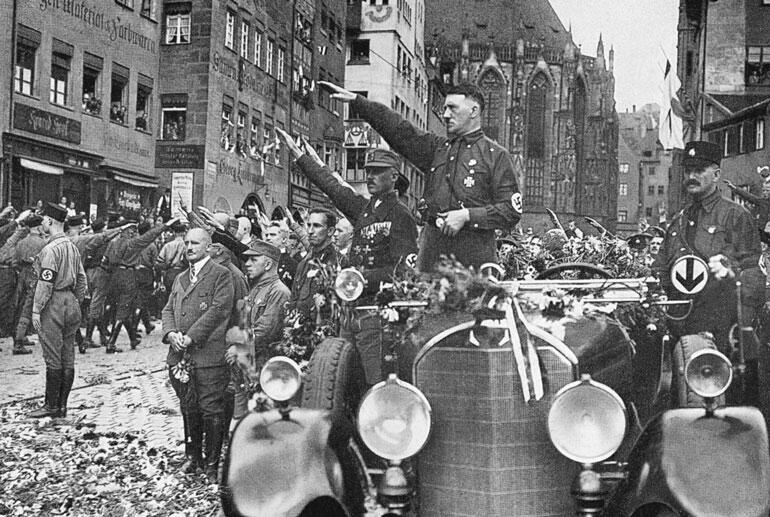 Адольф Гитлер (стоит на машине с непокрытой головой, вытянув в нацистском приветствии правую руку) мечтал о создании великого германского рейха, населенного этническими немцами и территориально увеличенного за счет «расширения жизненного пространства» на Востоке. Его грандиозные замыслы привели к тому, что в 1939 г. весь мир оказался втянут во Вторую мировую войну