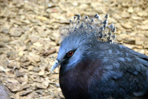 Это Веероносный венценосный голубь, вместе с ещё двумя похожими видами (голубохохлый венценосный и каштановогрудый венценосный) обитающий в Новой Гвинее и на прилегающих к ней островах (Биак, Япен, Вайгео, Серам, Салавати), а в Европу завезённый лишь в начале двадцатого века. Это очень крупный голубь, больше похожий на курицу, длиной до семидесяти сантиметров и весом до двух с половиной килограмм. К сожалению, то, что делает эту птицу такой красивой и такой крупной, является и её слабым местом из-за перьев, идущих на сувениры, и из-за мяса (а эта птица, не имея естественных врагов, весьма доверчива к людям) на венценосного голубя ведётся браконьерами неумеренная охота, да и привычная ему среда обитания постепенно разрушается.