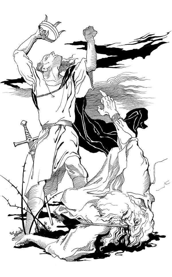І впав князь, і скотився вінець із його голови, і безліч рук потягнулося до вінця але ті, що торкнулися його, вмирали на місці. І закричав княжий син, і голос його розкотився, подібно до грому: