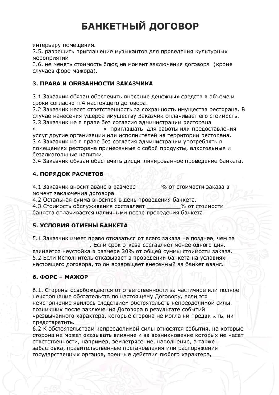 Пример такого банкетного договора представлен ниже. Вы можете взять его за основу и вносить свои изменения, согласно условиям конкретно вашего банкета.