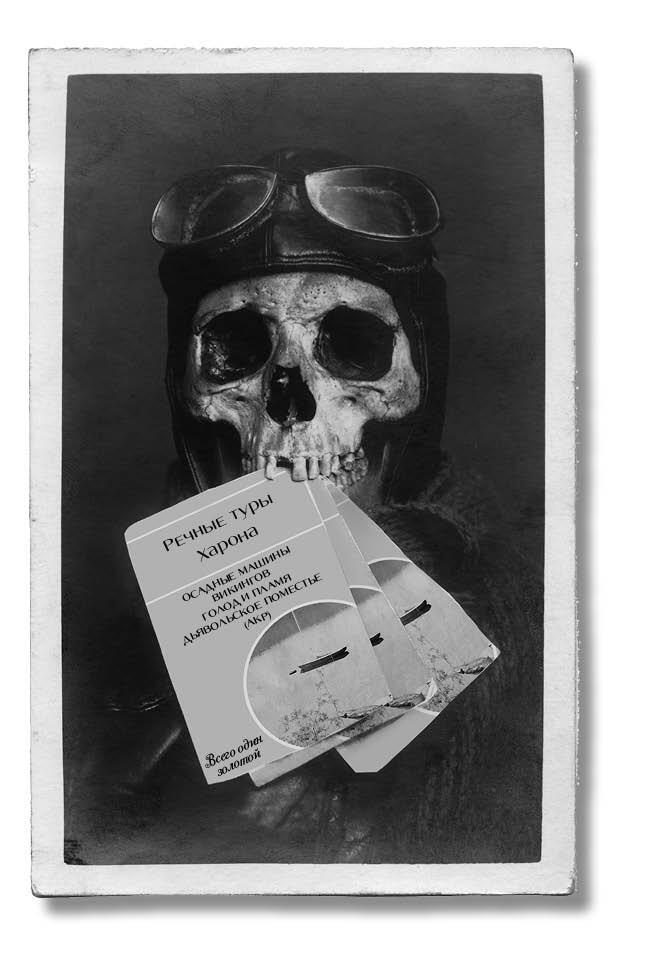 Он развернулся и подошел к одной из опор. К ней была прибита полка, на которой лежал череп в старинном кожаном авиационном шлеме, очках и щегольском шарфе. Из его зубов торчало несколько брошюр. Харон выбрал одну из них и подал мне. Это был дешевый туристический проспект, который, судя по виду, был напечатан, когда мой дедушка был совсем маленьким мальчиком. Я принялся листать буклет, а Харон откашлялся и заговорил: