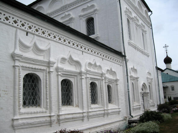Так как это женский монастырь, все строения здесь очень нарядны и живописны. Кокошниковый фриз, сложно декорированные пояски, разнообразной формы наличники, перспективные порталы, ажурные золотые кресты и главы, крытые цветной черепицей, создают яркий, насыщенный почти скульптурной пластикой декоративный убор храма Сретения Пресвятые Богородице Владимирская.