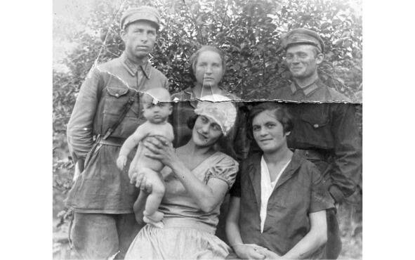На руках Елены Жаровой новорожденная дочь Алла. Слева стоит Николай Жаров. Остальные, видимо, сослуживцы, подруги и пр. 1929 г.