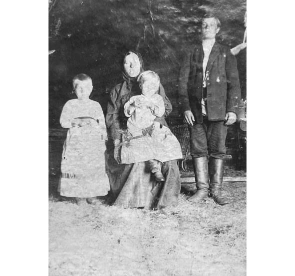 Думаю, вспоминая Молоково, уместно вернуться к фотографии предшествующих лет. Это самое раннее изображение Николаю лет 14 или 16. Он стоит в пиджаке поверх косоворотки, подпоясанной широким ремнем, в высоких сапогах. Из петлицы пиджака во внутренний карман тянется цепочка часы! Это говорит о многом: и об определенном достатке и главное о статусе взрослого! На стуле сидит бабушка Анна с Глафирой на руках и рядом стоящей Марией. Одежда детей украшена атласными лентами. На бабушке Анне («бабушкой» ее тут не следовало бы называть: в эти годы ей было 34 года) платок с бахромой и юбка из ткани с узорами Об этой фотографии известно также, что делал ее местный священник, увлекавшийся фотографированием.
