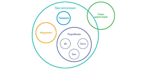 Структура компании гибкая и постоянно меняется. Сотрудники могут принадлежать к нескольким кругам (отделам) и переходить из одного в другой.